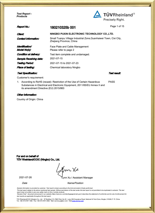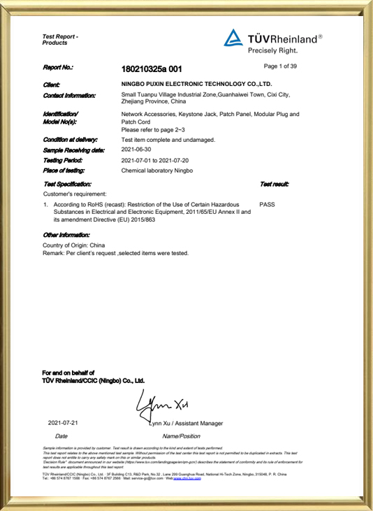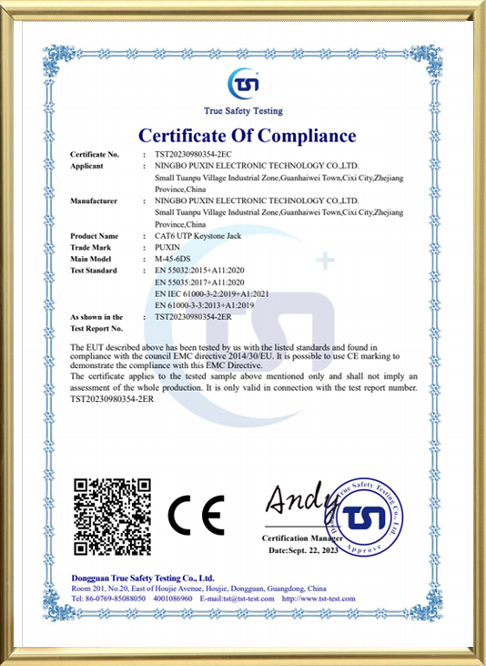 NINGBO PUXIN Electronic Technology Co., Ltd har etablerat i mer än 15 år, som är specialiserat på produktion av integrerade nätverkskablingprodukter och optiska fiberprodukter, inklusive koppar CAT5E, CAT6, CAT6A, CAT7, CAT8, såsom Keystone Jack, Patch Panel, RJ45 Connector, Patch Cord och andra relaterade produkter.
