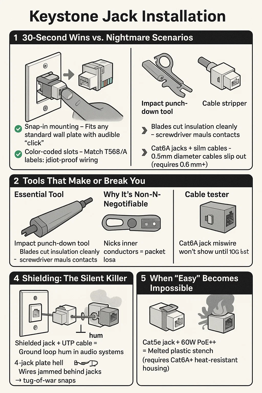 Omedelbara felfällor: * Försök med tvinnad kabel – IDC-blad river sönder tvinnade ledningar (endast fast kärna!). * Cat6A-uttag smala kablar – kablar med en diameter på 0,5 mm glider ut (kräver 0,6 mm).