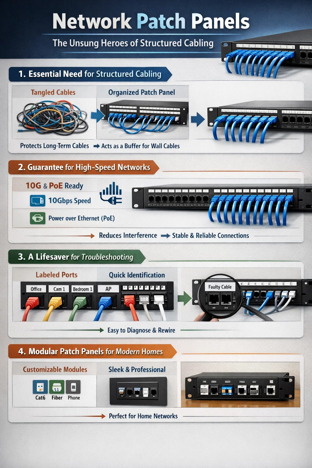 Fysiskt lagerskydd: Nätverkskablarna inuti väggarna är vanligtvis stela. Om de är anslutna direkt till en strömbrytare, kan frekvent in- och urkoppling och rörelse göra att trådkärnorna går sönder. Patchpanelen fungerar som en buffert; den förblir stationär och du flyttar bara de korta patchkablarna på utsidan, vilket skyddar de dyra långa kablarna inuti väggen.