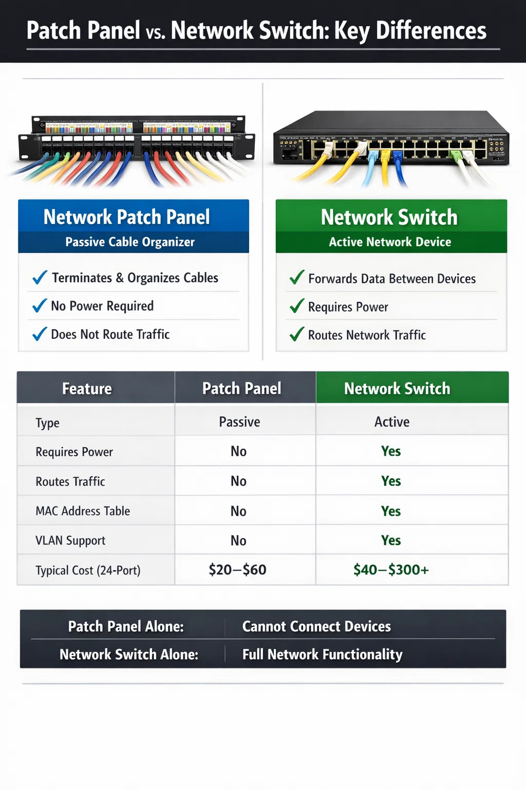 A nätverkspatchpanel är ett organisatoriskt verktyg för strukturerad kabeldragning. Den är helt passiv, kräver ingen ström och ger noll nätverksfunktionalitet på egen hand. En nätverksswitch är den aktiva hjärnan i ditt trådbundna nätverk — utan den kommunicerar ingenting. Du behöver en switch oavsett om du använder en patchpanel.