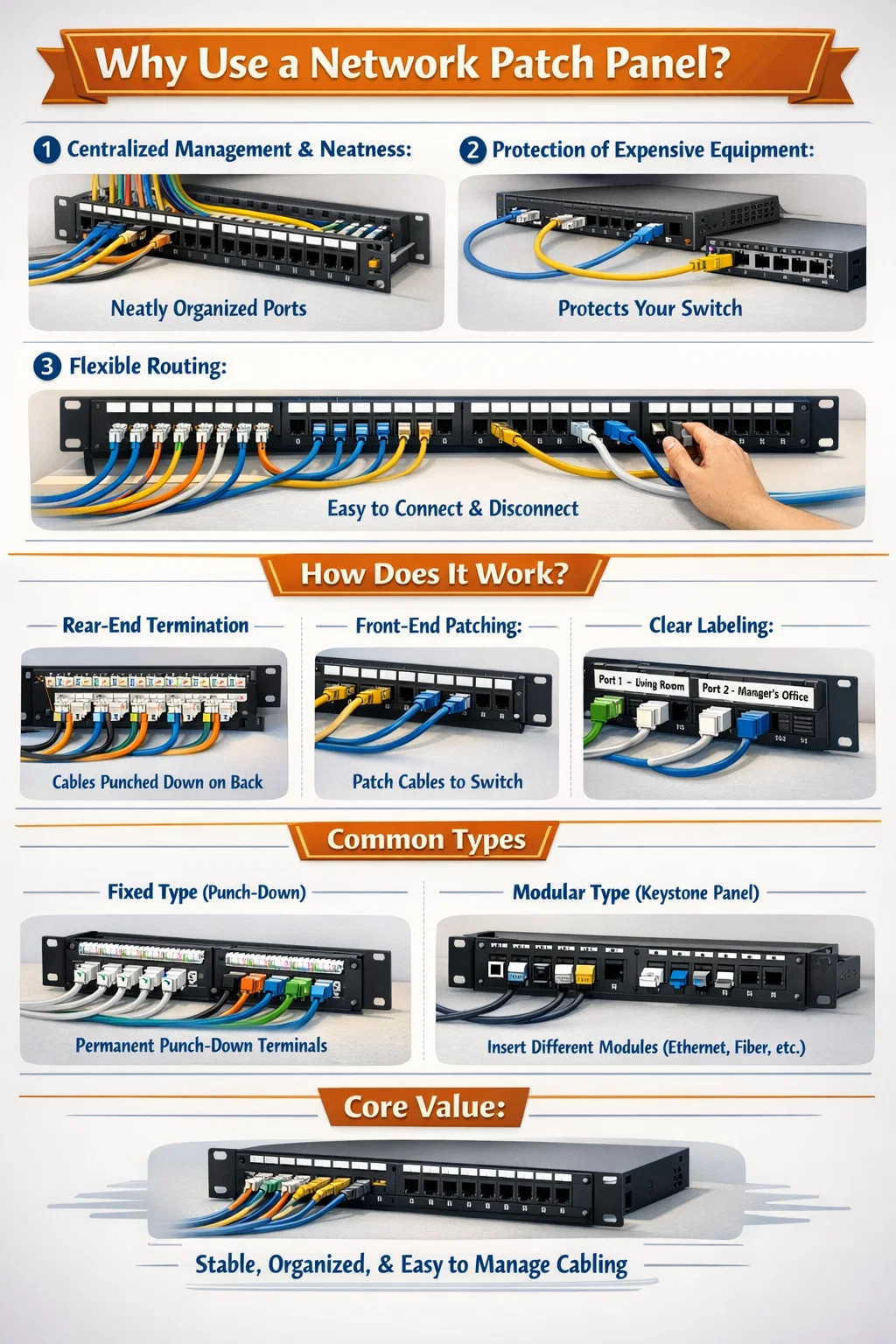 Tänk dig om du hade nätverkskablar från 20 rum direkt anslutna till en switch; om kablarna trasslar ihop sig blir det en enda röra. Med en nätverkspatchpanel är alla långa kablar som kommer ut från väggarna snyggt fastsatta på baksidan av panelen, medan fronten har en serie snyggt arrangerade portar.