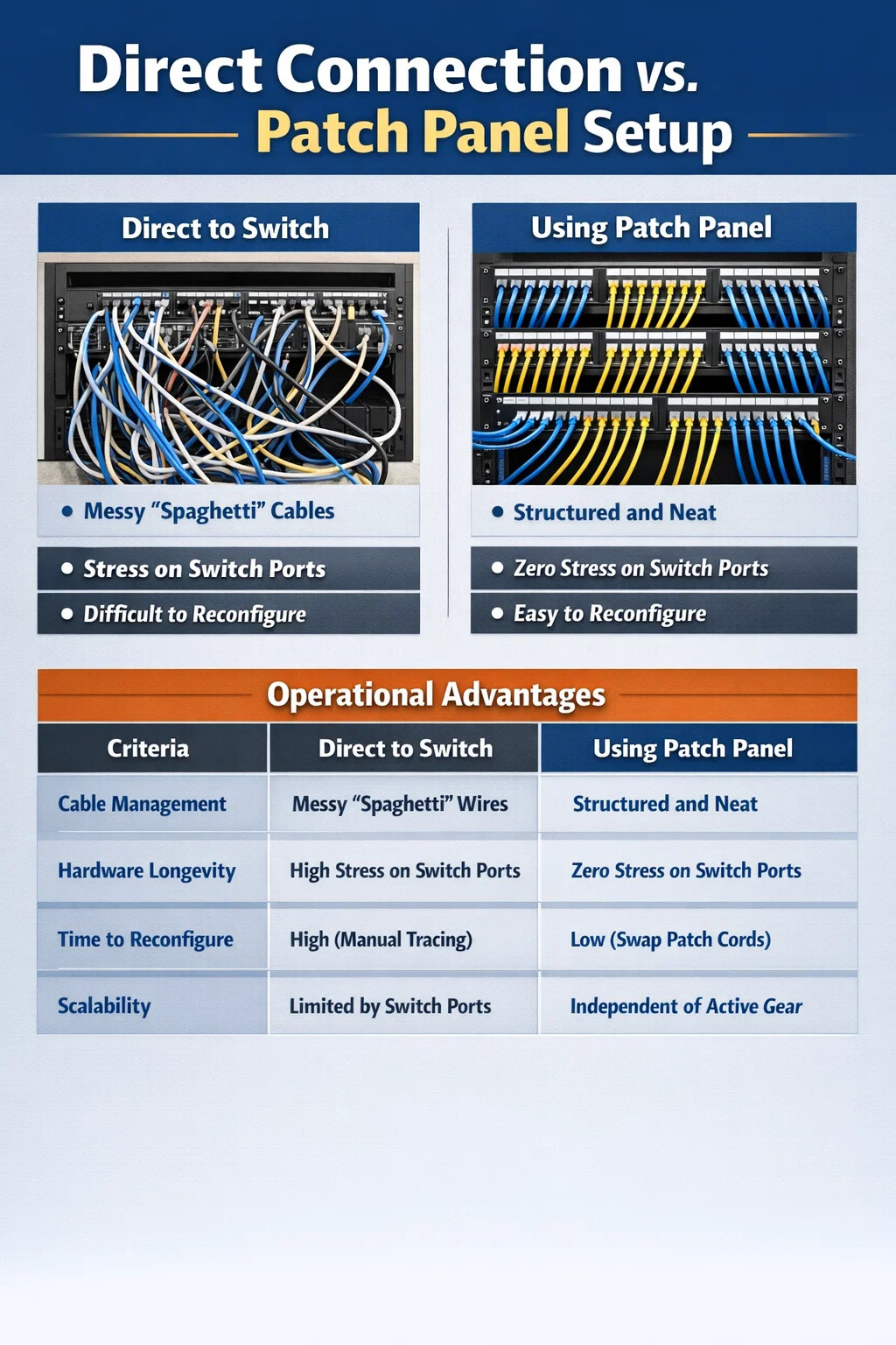 Nätverkstekniken utvecklas snabbt. Idag kanske du använder en 1Gbps-switch, men om tre år kanske du vill uppgradera till en 10Gbps PoE-switch för avancerade Wi-Fi 7-åtkomstpunkter. Om dina kablar är direkt anslutna till den gamla switchen innebär uppgraderingen att du kopplar ur allt och riskerar kabelskador.