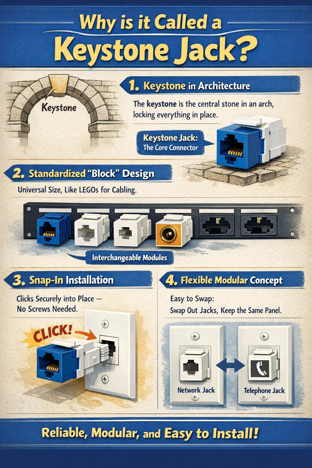 The reason why this network connector is called a Keystone Jack is due to a very apt analogy related to its design and installation method.
